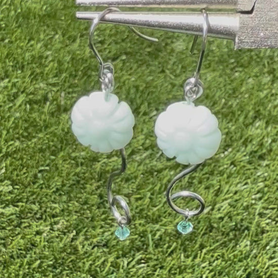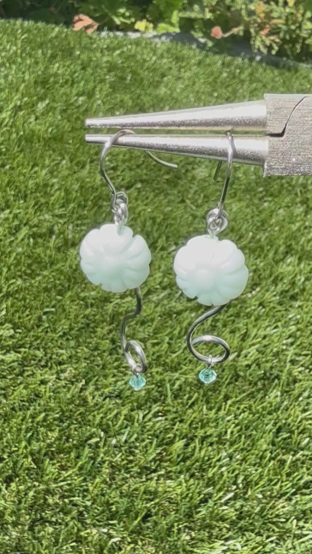 One of a kind! Genuine amazonite carved flower adorned on a stainless steel swirl of wire, with droplets of teal glass crystals & stainless steel ear hooks. Color of the amazonite may vary, as it is a natural material.
