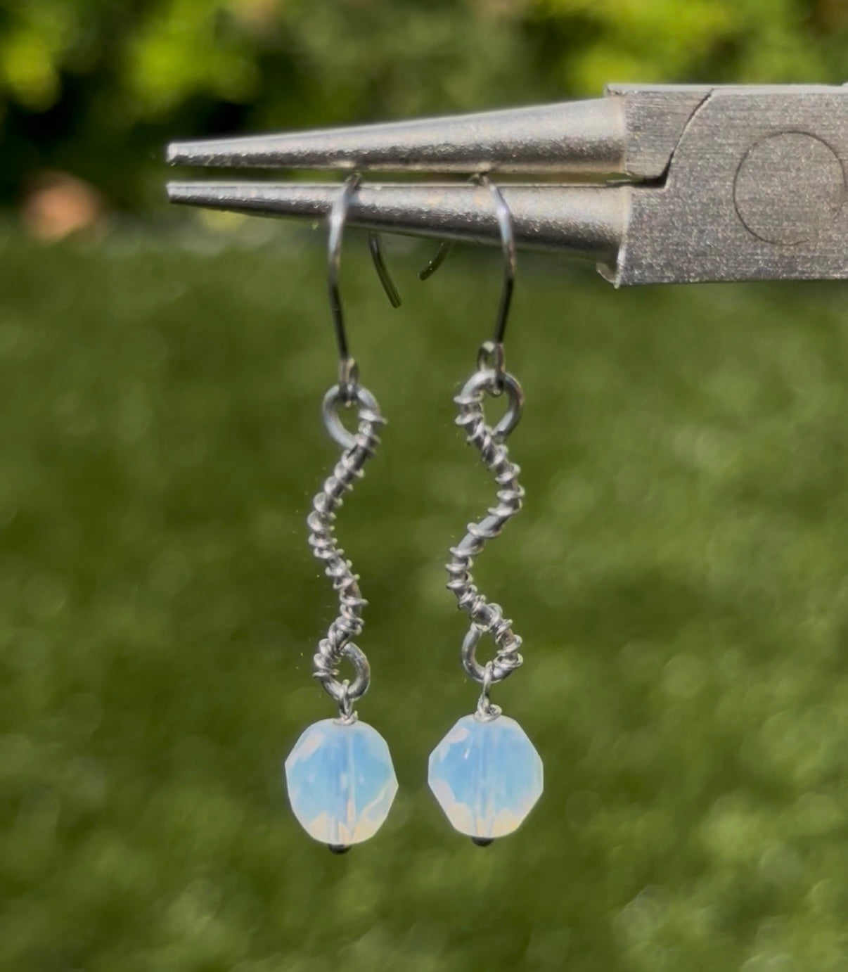 This piece is a truly special, one-of-one design that came from experimenting with wire-bending. Featuring all stainless steel hardware, wrapped to wavy perfection, and adorned with faceted opalite.